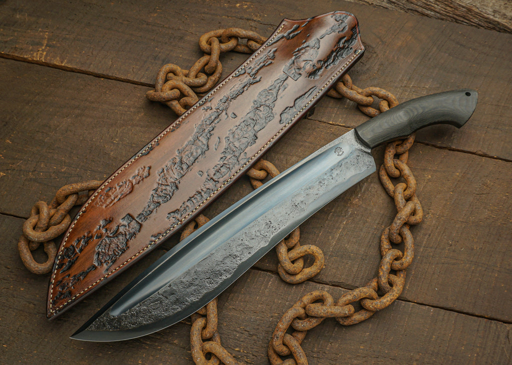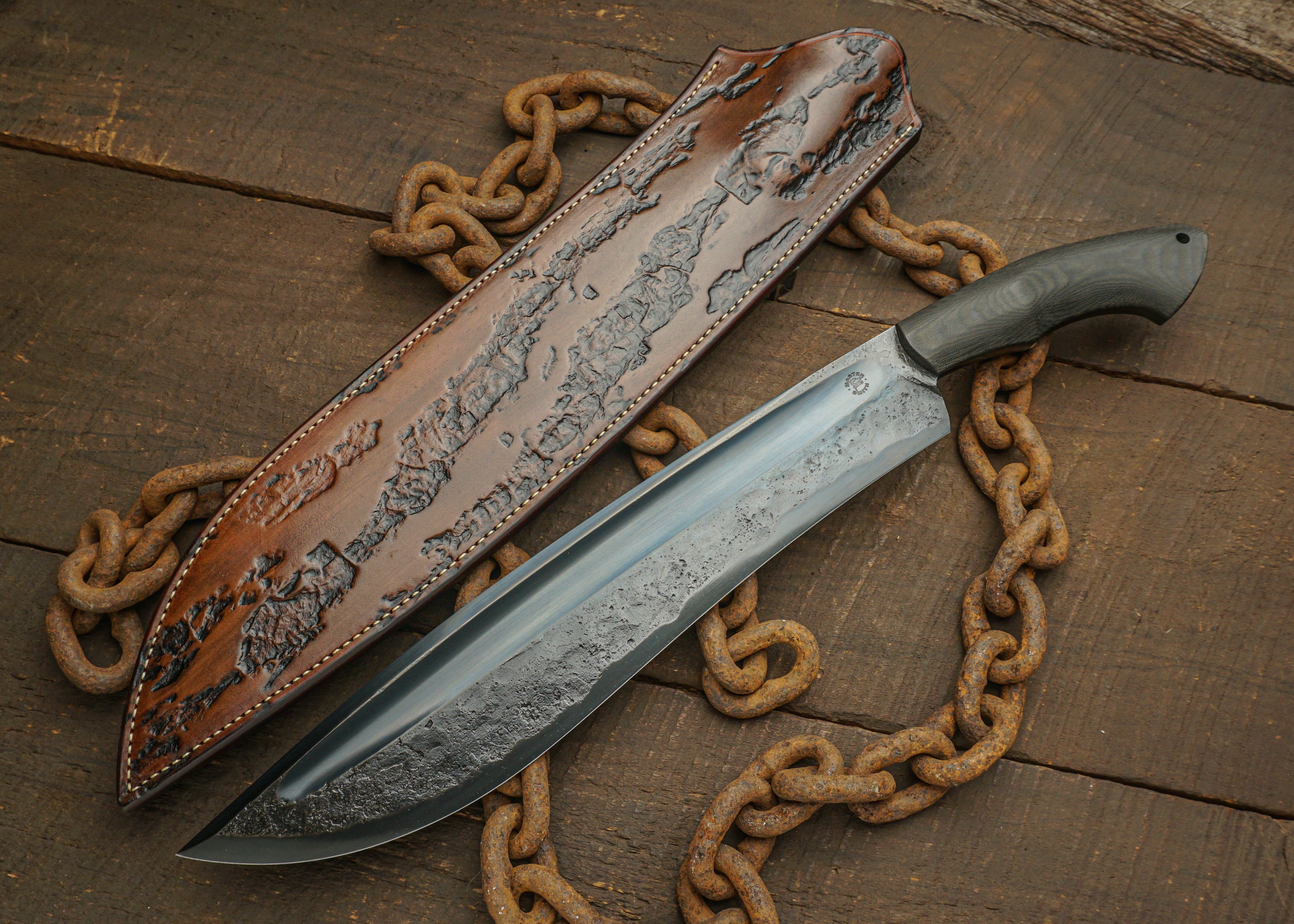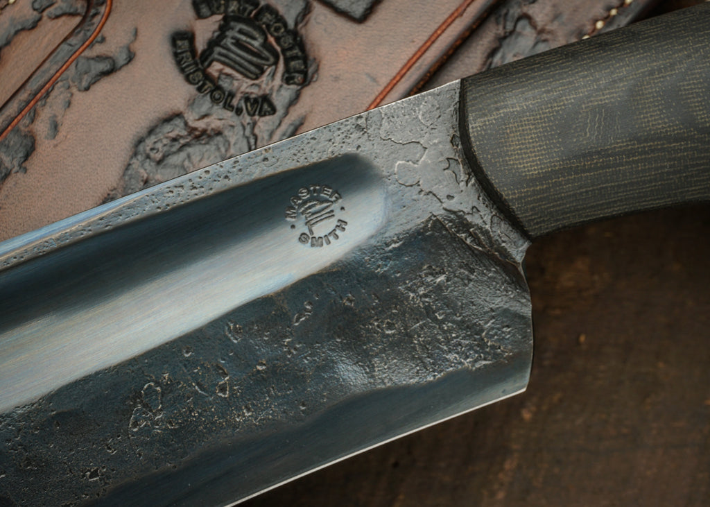 Forged from 80CRV2, it was forged to shape (including a forged fuller). I decided to grind the fuller to further reduce weight, and the entire blade is finished a deep, shimmery blue.