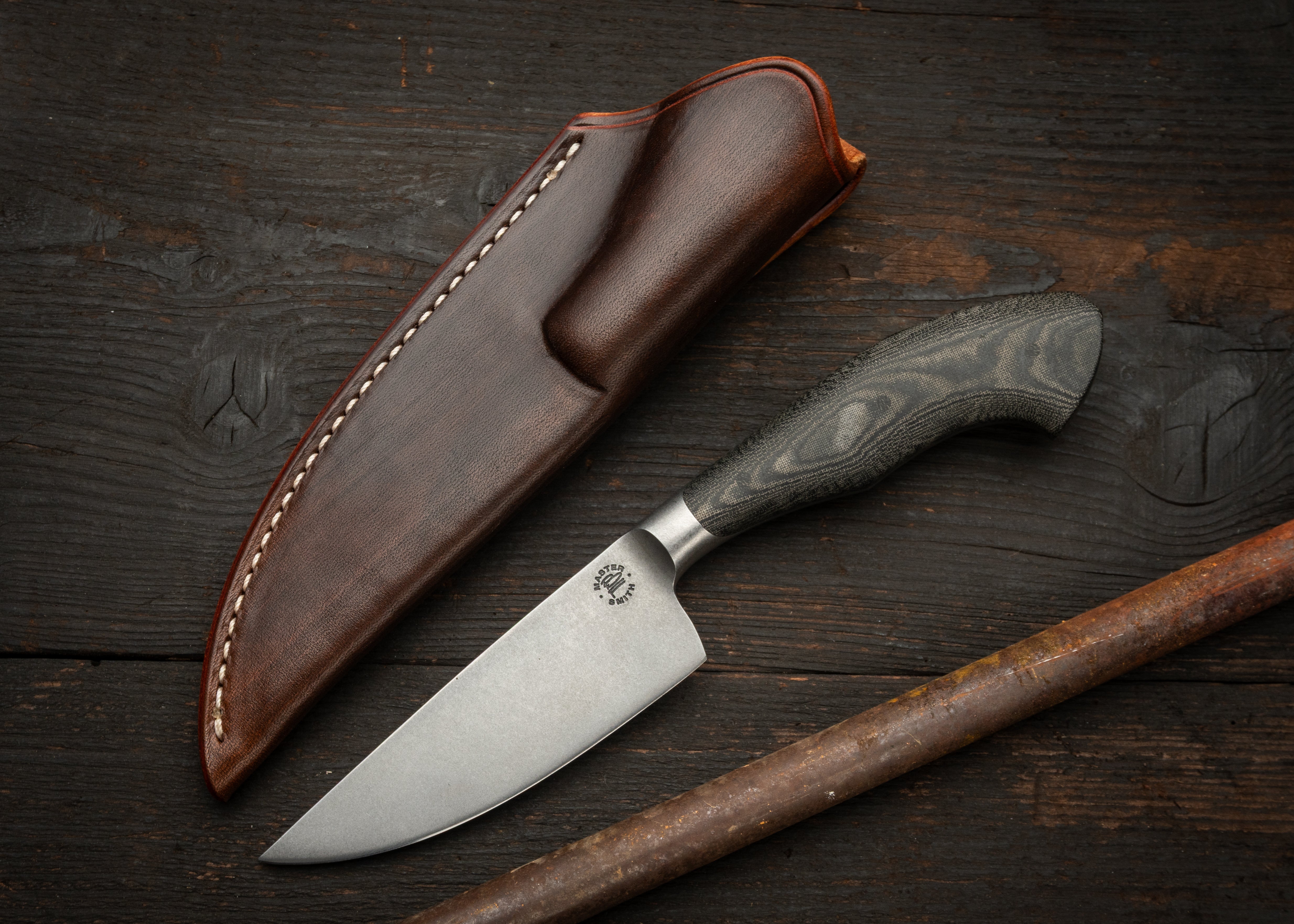 The black linen micarta handle scales are ground to mate to the curved transitions of the steel and secured with micarta pins.