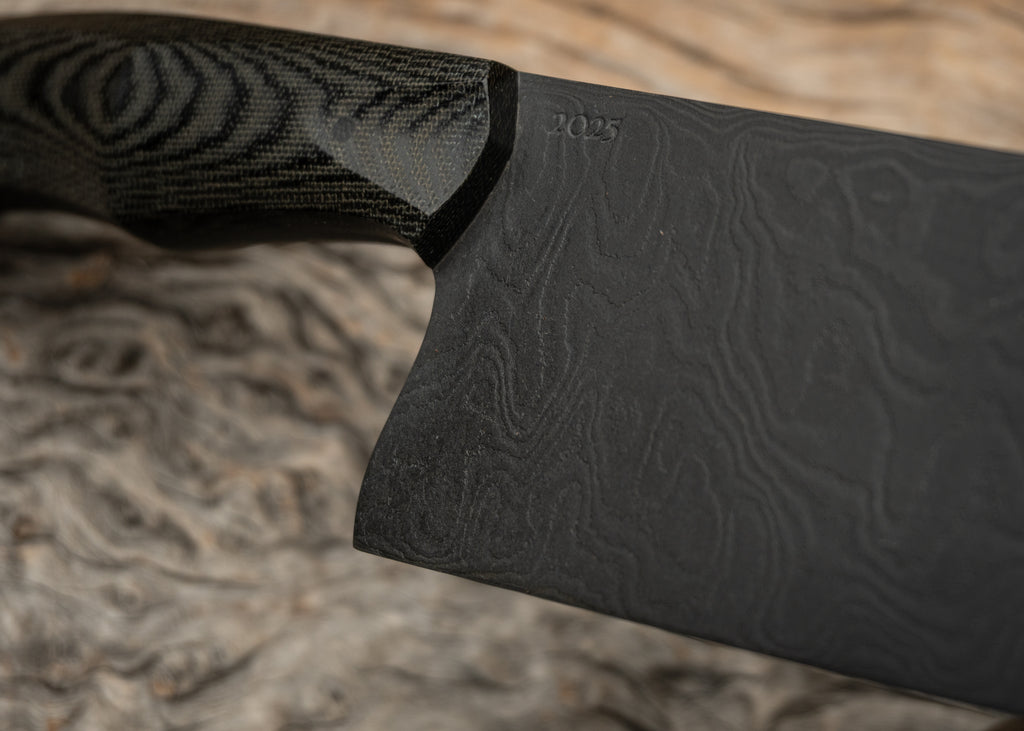 The blade is forged, woodgrain Damascus (80CRV2 and 15N20), ground very thin and deeply etched. The entire blade has been Parkerized, a black phosphate coating best knows as the metal finish of choice on so many WWII-era firearms. It's nearly black, non-reflective, and very durable.