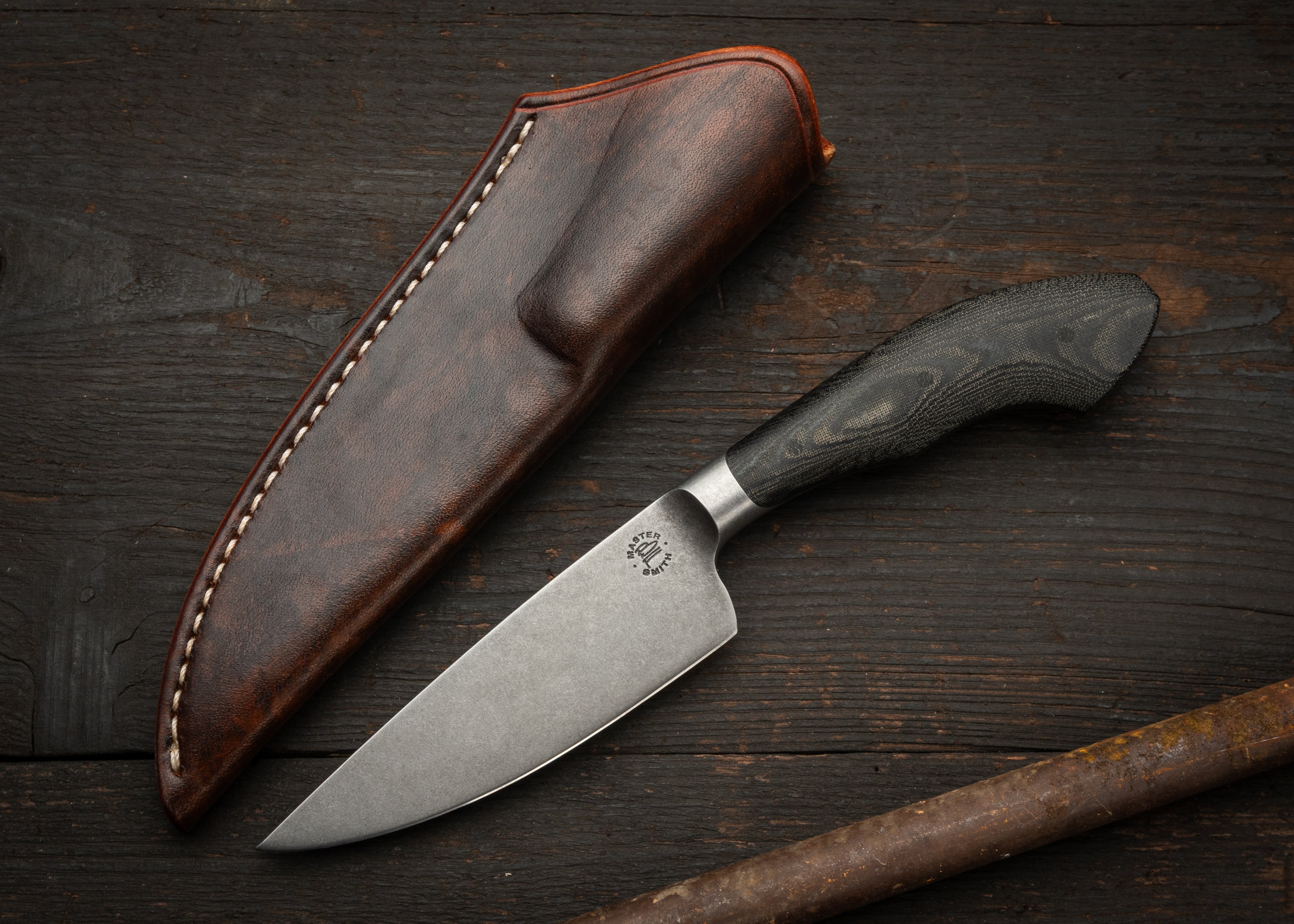 The black linen micarta handle scales are ground to mate to the curved transitions of the steel and secured with micarta pins.